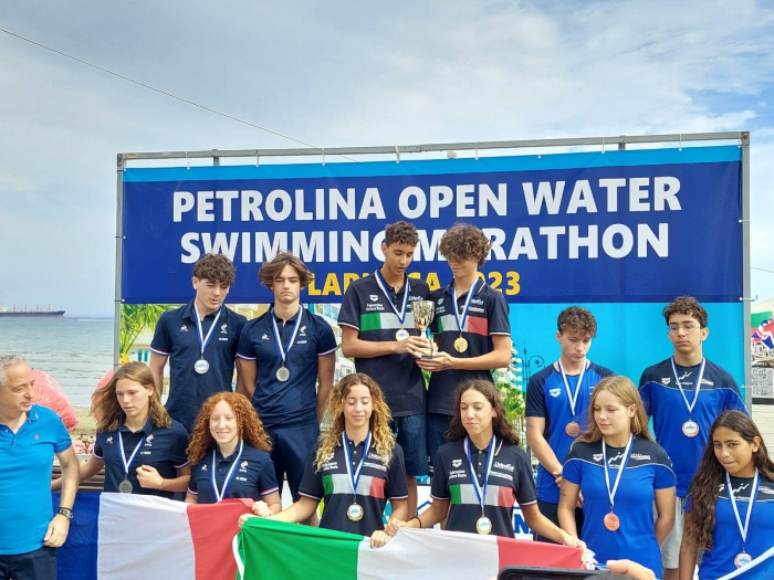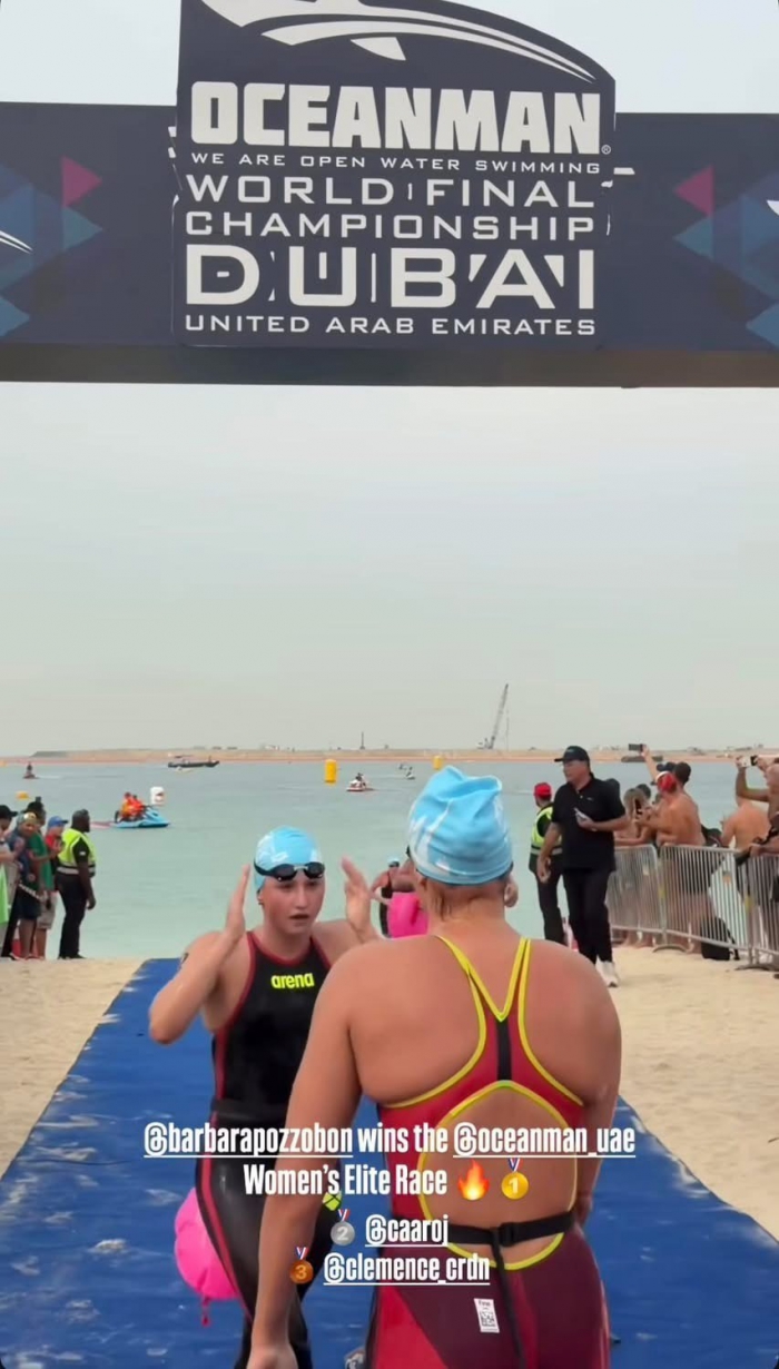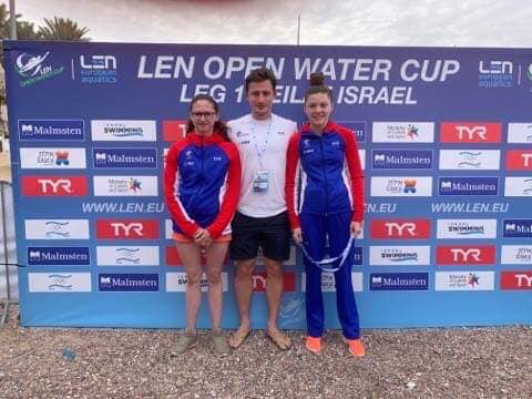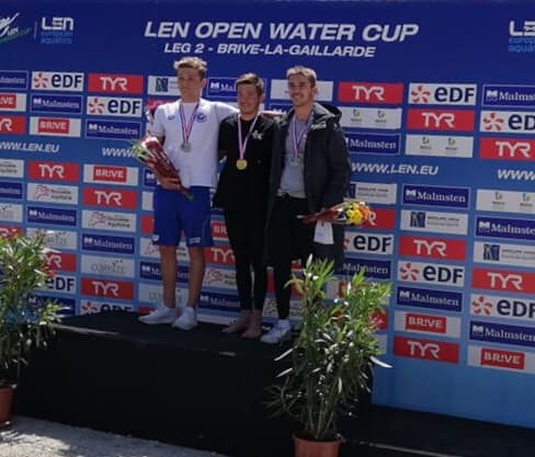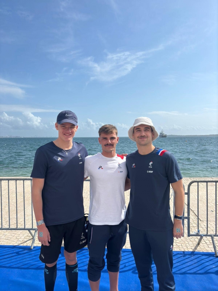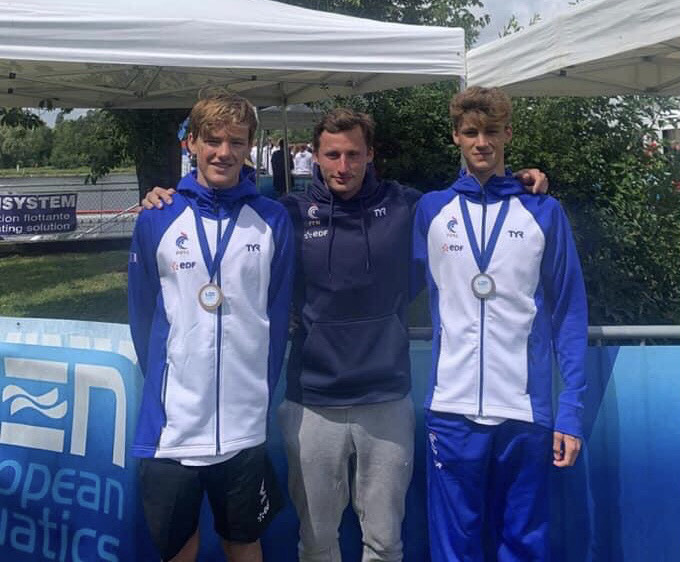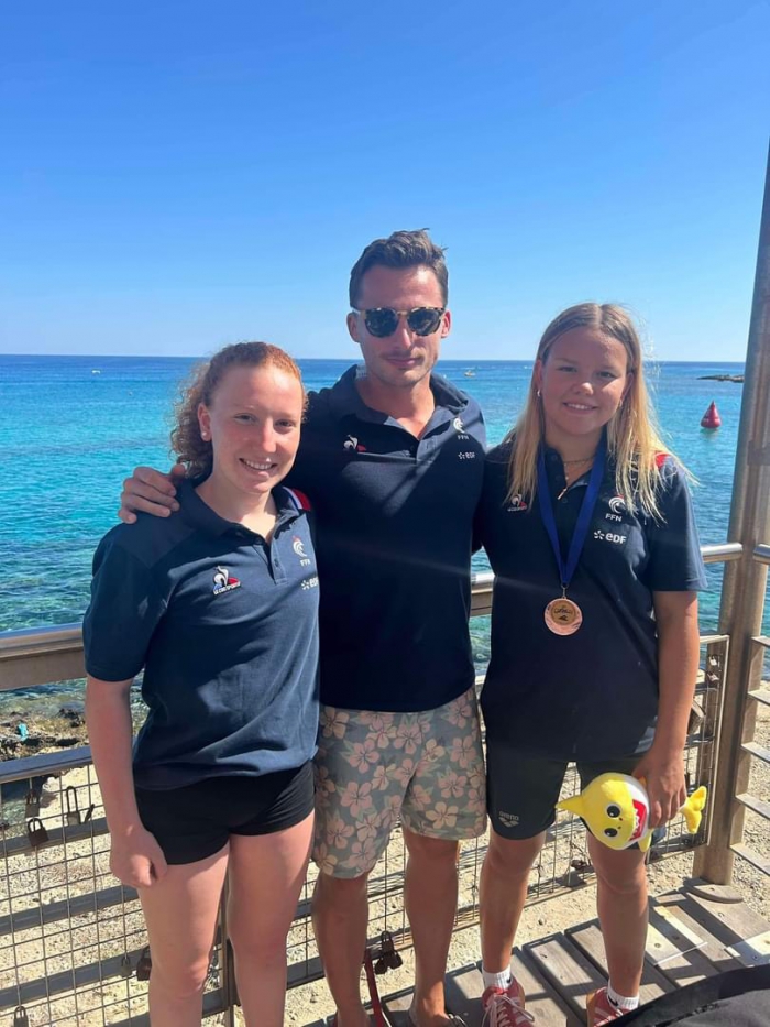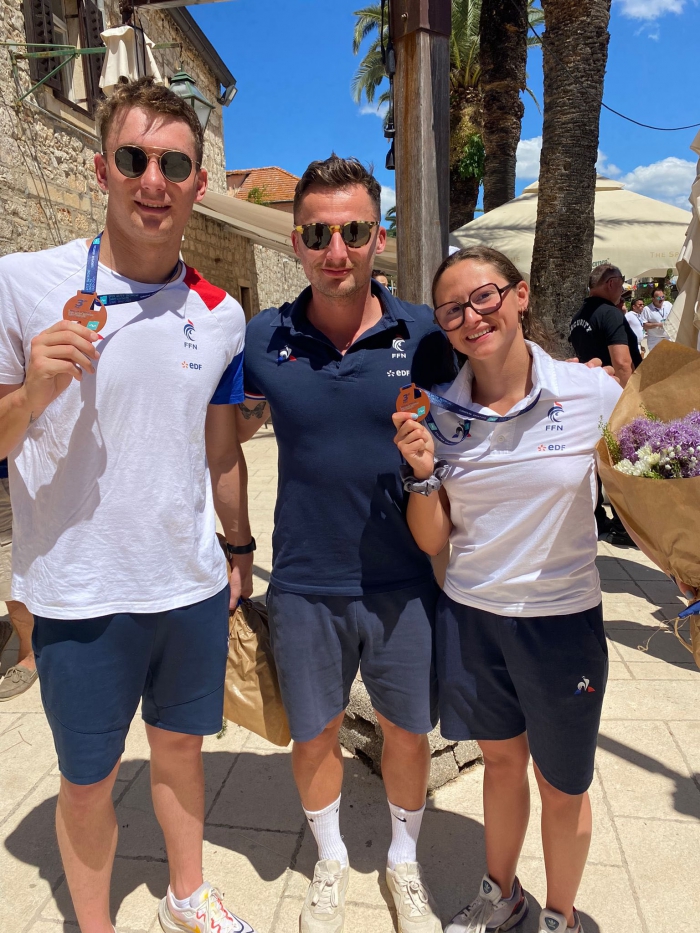 En photo Sacha,Clémence médaillés de bronze lors des Championnats d’Europe Eau Libre en mai 2025 à Stari Grad (Croatie) entourant leur entraîneur Thomas