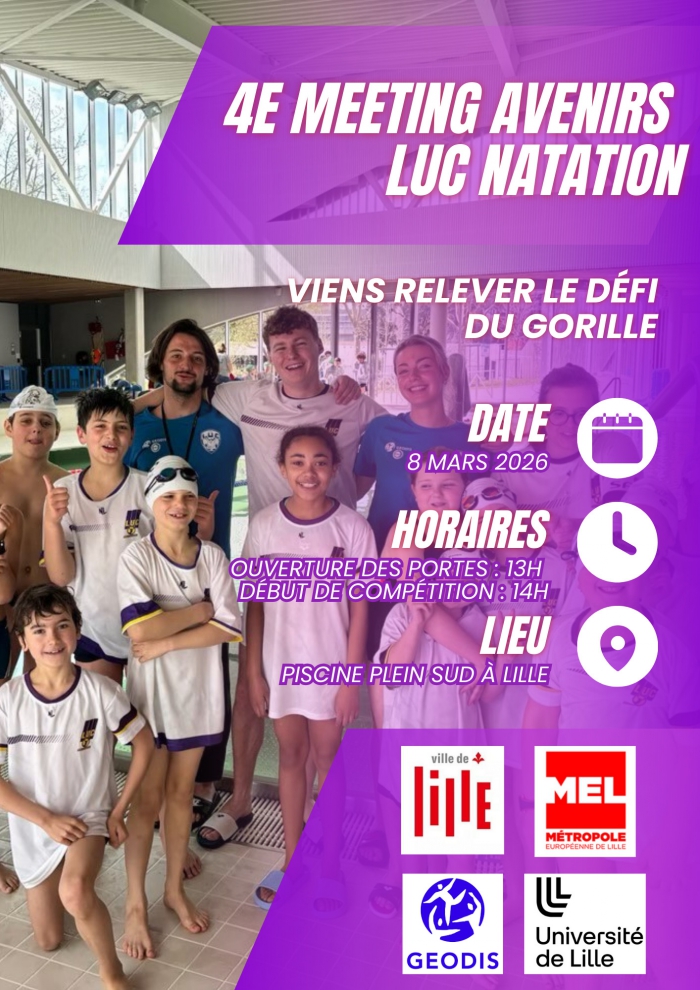 Venez nombreux pour participer à notre 4e Meeting des Avenirs du LUC Natation le dimanche 8 Mars 2026 à la piscine Plein Sud de Lille !